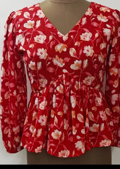 Red Floral Printed Full Sleeves Peplum Top with Back Tie