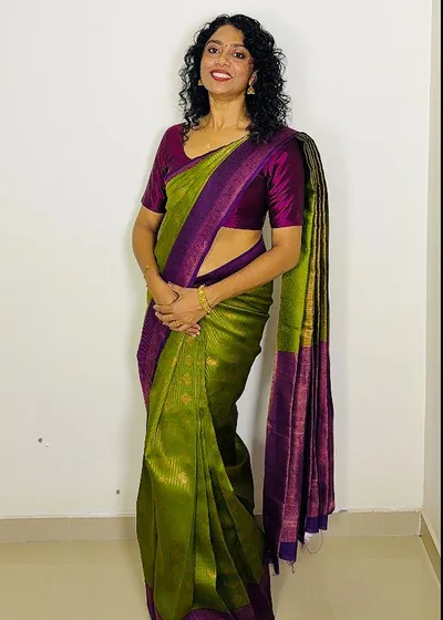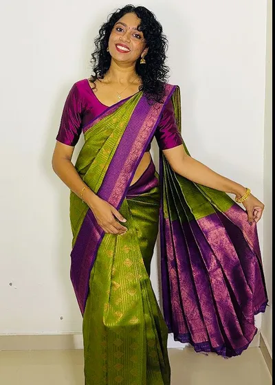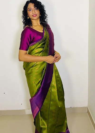 Embrace elegance with our Blooming Green and Purple contrast colour Semi Silk Saree, a true symbol of sophistication and grace. This exquisite saree features a mesmerising zari design that is sure to captivate all those around you. Paired with a vivacious blouse piece, this ensemble exudes luxury and style, making it the perfect choice for any special occasion.