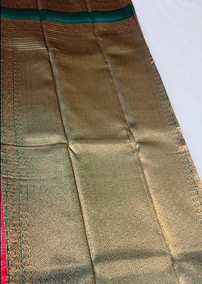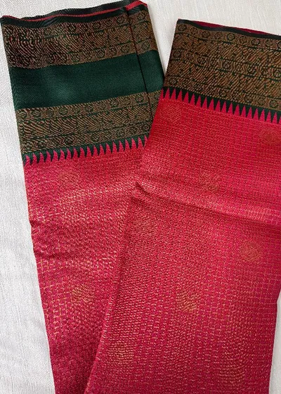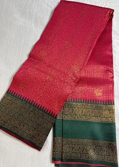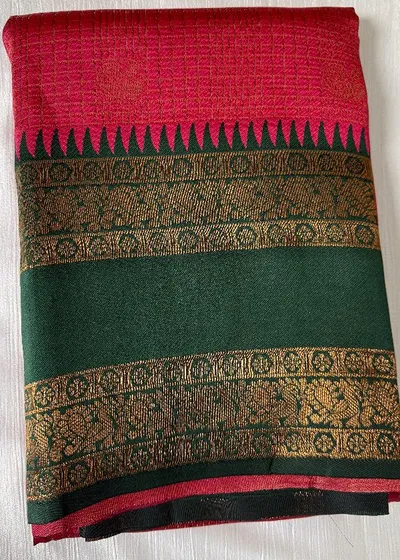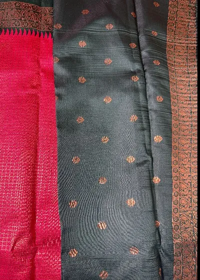 Embrace elegance with our Blooming Dark Peach with Bottle Green contrast colour Border Semi Silk Saree, a true symbol of sophistication and grace. This exquisite saree features a mesmerising zari design that is sure to captivate all those around you. Paired with a vivacious blouse piece, this ensemble exudes luxury and style, making it the perfect choice for any special occasion.